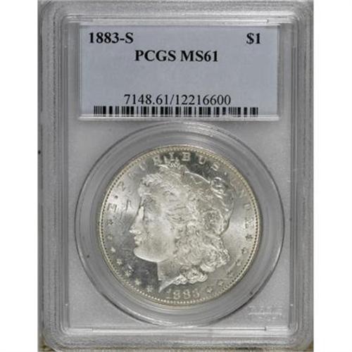 <B>1883-S $1 MS61 PCGS.</B></I> Sharply struck and flashy with a measure of frost on the central devices. This minimally toned piece shows myriad light to moderate abrasions that account for the grade.<BR><BR><B>Coin Engraver:</B> George T. Morgan<BR><BR><b>Shipping:</b> Coins & Currency (<a target="_blank" href="http://www.heritageauctions.com/common/shipping.php">view shipping information</a>)