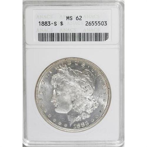 <B>1883-S $1 MS62 ANACS.</B></I> A brilliant and flashy representative of this conditionally rare issue. Well struck and lightly toned with a relatively clean reverse and only moderate marks on the portrait.<BR><BR><b>Shipping:</b> Coins & Currency (<a target="_blank" href="http://www.heritageauctions.com/common/shipping.php">view shipping information</a>)