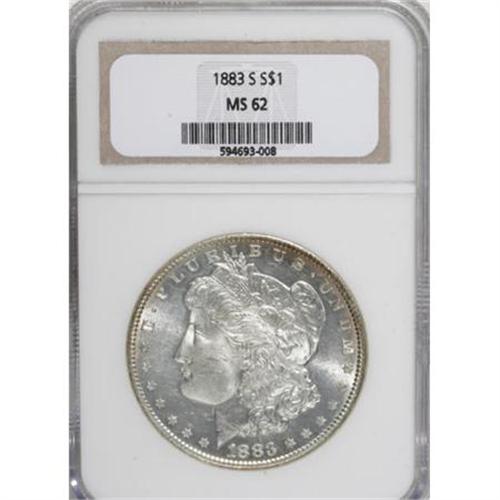<B>1883-S $1 MS62 NGC.</B></I> We offer here an exquisitely struck coin that yields prooflike characteristics on the obverse. Barely discernible color occurs at the rims. Minute obverse contact marks limit the grade.<BR><BR><B>Coin Engraver:</B> George T. Morgan<BR><BR><b>Shipping:</b> Coins & Currency (<a target="_blank" href="http://www.heritageauctions.com/common/shipping.php">view shipping information</a>)