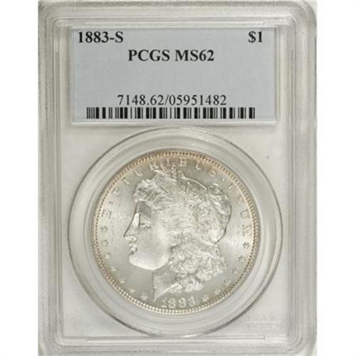 <B>1883-S $1 MS62 PCGS.</B></I> Light peach-gold toning clings to the peripheries of this flashy and attentively struck better date dollar. The fields are unexpectedly clean, and even the cheek has only moderate grazes.<BR><BR><b>Shipping:</b> Coins & Currency (<a target="_blank" href="http://www.heritageauctions.com/common/shipping.php">view shipping information</a>)