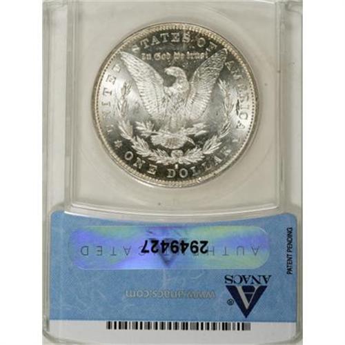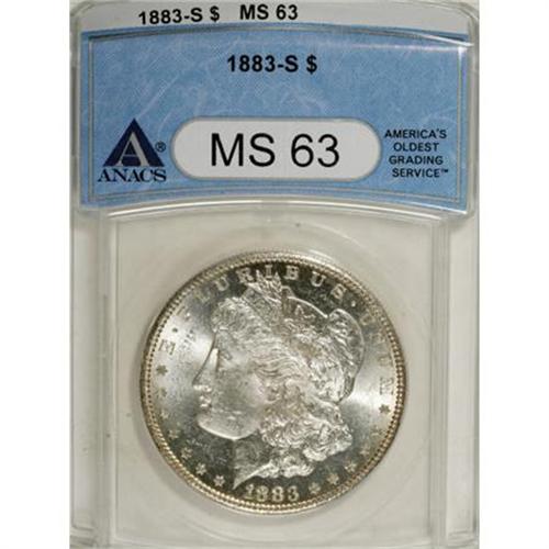 <B>1883-S $1 MS63 ANACS.</B></I> A flashy and sharply struck Select example of this earlier S-mint Morgan dollar issue. Hints of silver-gray patina appear on each side, as do a number of tiny abrasions.<BR><BR><B>Coin Engraver:</B> George T. Morgan<BR><BR><b>Shipping:</b> Coins & Currency (<a target="_blank" href="http://www.heritageauctions.com/common/shipping.php">view shipping information</a>)