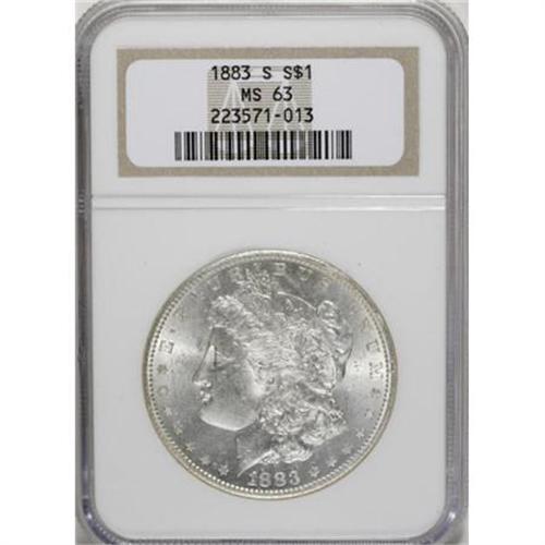 <B>1883-S $1 MS63 NGC.</B></I> This solidly struck S-mint example is predominantly silver-white with scattered ice-blue tints. Lightly abraded overall with strong luster on the obverse and a flashy reverse.<BR><I>From The Mario Eller Collection, Part One.</B></I><BR><BR><B>Coin Engraver:</B> George T. Morgan<BR><BR><b>Shipping:</b> Coins & Currency (<a target="_blank" href="http://www.heritageauctions.com/common/shipping.php">view shipping information</a>)