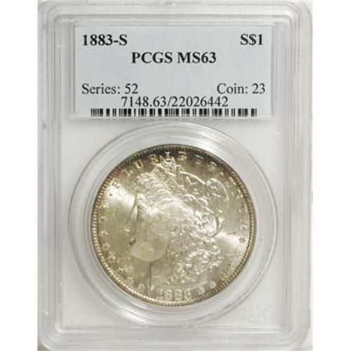 <B>1883-S $1 MS63 PCGS.</B></I> Radiant cartwheel luster and attractive peripheral toning (reminiscent of ex Redfield coins) more than compensate for a few ill-placed milling marks on the obverse.<BR><BR><B>Coin Engraver:</B> George T. Morgan<BR><BR><b>Shipping:</b> Coins & Currency (<a target="_blank" href="http://www.heritageauctions.com/common/shipping.php">view shipping information</a>\)