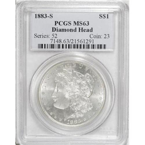 <B>1883-S $1 MS63 PCGS.</B></I> Ex: Diamond Head. A lustrous, boldly struck, and brilliant representative that has a clean reverse and a smooth obverse field. Moderate facial marks decide the grade.<BR><I>From the Diamond Head Registry Set of Prooflike Dollars.</B></I><BR><BR><B>Coin Engraver:</B> George T. Morgan<BR><BR><b>Shipping:</b> Coins & Currency (<a target="_blank" href="http://www.heritageauctions.com/common/shipping.php">view shipping information</a>\)
