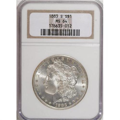 <B>1883-S $1 MS64 NGC.</B></I> An excellent example of this extremely challenging San Francisco issue which is infrequently seen in grades approaching gem and is quite elusive in Gem and finer. This example features bright, nearly untoned silvery surfaces with excellent cartwheel luster. A few too many scattered abrasions, including some diagonal marks below Liberty's eye on the obverse limit the grade, but the appeal is still considerable. <BR><BR><B>Coin Engraver:</B> George T. Morgan<BR><BR><b>Shipping:</b> Coins & Currency (<a target="_blank" href="http://www.heritageauctions.com/common/shipping.php">view shipping information</a>)