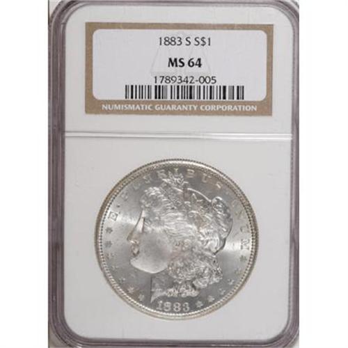 <B>1883-S $1 MS64 NGC.</B></I> The 1883-S dollar is extremely difficult to locate in Gem condition, and even near-Gems are not all that available. The MS64 coin we offer in this lot displays pleasing bright luster that exudes from untoned surfaces. All of the design elements exhibit crisp definition, further enhancing the coin's eye appeal. A few inoffensive marks are all that stands in the way of a higher grade.<BR><BR><B>Coin Engraver:</B> George T. Morgan<BR><BR><b>Shipping:</b> Coins & Currency (<a target="_blank" href="http://www.heritageauctions.com/common/shipping.php">view shipping information</a>)