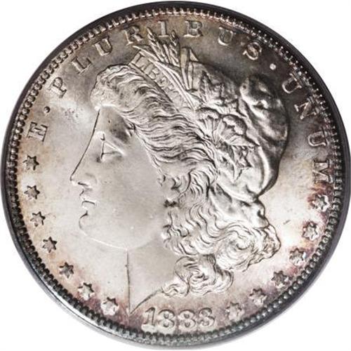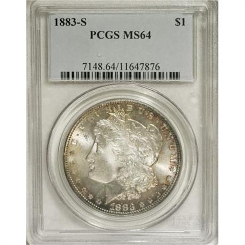 <B>1883-S $1 MS64 PCGS.</B></I> While the San Francisco issues between 1878 and 1882 are commonplace, the 1883-S and 1884-S are surprisingly scarce in Mint State despite mintages in the millions. This is a beautiful near-Gem with peripheral gold and plum-red obverse toning. The reverse is nearly brilliant. Lustrous and minimally abraded with a good strike.<BR><BR><b>Shipping:</b> Coins & Currency (<a target="_blank" href="http://www.heritageauctions.com/common/shipping.php">view shipping information</a>)