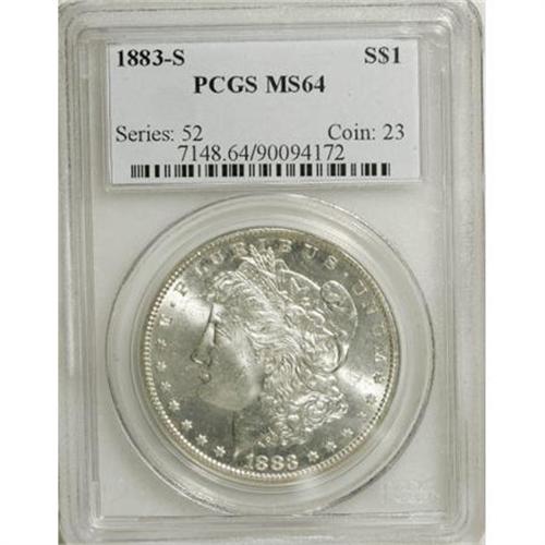 <B>1883-S $1 MS64 PCGS.</B></I> A sharp strike with brilliant silver luster and attractive eye appeal. From a mintage of over 6 million coins, this issue is common in all circulated grades, but it becomes scarce in MS60 or higher. Choice quality specimens, such as the example we are offering here, are scarce, and Gems are rare.<BR><I>Ex: The Chicago-Ark Collection (Heritage, 8/06), lot 2653, which realized $4,600.</B></I><BR><BR><b>Shipping:</b> Coins & Currency (<a target="_blank" href="http://www.heritageauctions.com/common/shipping.php">view shipping information</a>)
