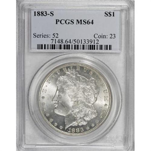 <B>1883-S $1 MS64 PCGS.</B></I> <B>1883-S S$1 MS64 PCGS.</B></I> An extraordinary example of this difficult S-mint issue, seldom seen in near-Gem and quite elusive in Gem grade. This piece has untoned silver surfaces with excellent cartwheel luster. A few abrasions, including some reeding marks and a luster graze on Liberty's cheek, limit a higher grade, but this piece nonetheless offers good eye appeal. PCGS has certified 17 coins finer (8/07).<BR><BR><B>Coin Engraver:</B> George T. Morgan<BR><BR><b>Shipping:</b> Coins & Currency (<a target="_blank" href="http://www.heritageauctions.com/common/shipping.php">view shipping information</a>)