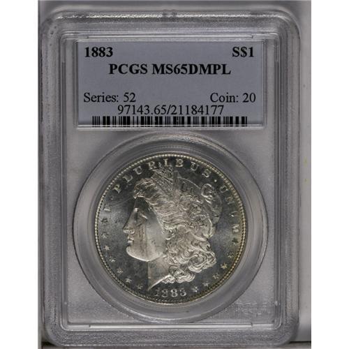 <B>1883<img border='0' src='http://www.heritagecoins.com/images/star.gif' width=10 height=10>$1> MS65 Deep Mirror Prooflike PCGS.</B></I> The right obverse border has a hint of lemon patina. A well struck Gem that has impressively mirrored fields and a tiny contact mark below Liberty's eye. The devices are moderately frosty. Population: 65 in 65 DMPL, 7 finer (5/06).