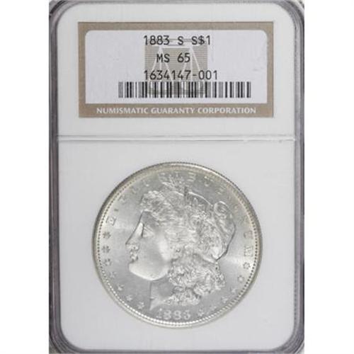 <B>1883-S $1 MS65 NGC.</B></I> The 1883-S dollar comes with a mintage of 6,250,000 pieces. David Bowers, in his book, <I>A Complete History and Price Guide</B></I>, writes that: "The distribution of the 1883-S began in large quantity soon after the mintage, with the result that examples in all grades were available to numismatists generations ago. However, by the 1940s the issue was viewed as scarce. In the 1950s some bags were released, but probably just a few. At least part of a bag found its way to Nevada investor LaVere Redfield. I am not aware of any quantities in the 1962-1964 Treasury release."<BR> Dazzling luster exudes from both sides of this Gem. Untoned surfaces exhibit well impressed design features, including sharp definition in the hair at Liberty's ear and on the eagle's breast feathers. The few unobtrusive marks scattered about do not distract, and are certainly within the parameters of the MS65 grade designation. Census: 15 in 65, 3 finer (6/07).<BR><I>From the Reuben Reinstein Collection.</B></I><BR><BR><b>Shipping:</b> Coins & Currency (<a target="_blank" href="http://www.heritageauctions.com/common/shipping.php">view shipping information</a>)