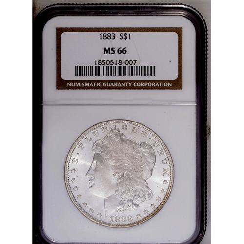 <B>1883<img border='0' src='http://www.heritagecoins.com/images/star.gif' width=10 height=10>$1> MS66 NGC.</B></I> A flashy example with dusty rose on the sharply struck and lightly frosted devices. The fields are essentially untoned and free of significant distractions.