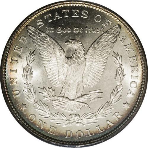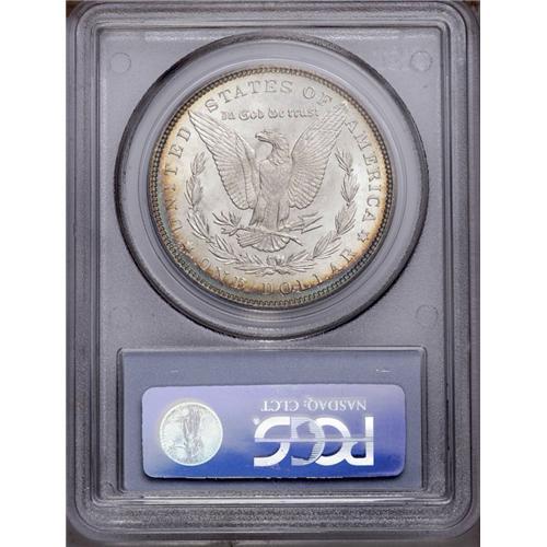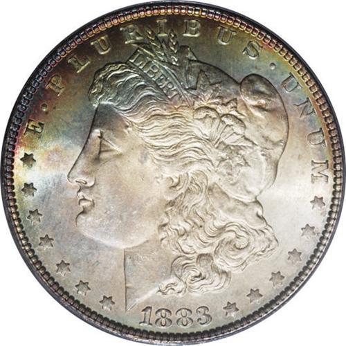 <B>1883<img border='0' src='http://www.heritagecoins.com/images/star.gif' width=10 height=10>$1> MS66 PCGS.</B></I> An above-average coin with absolutely exceptional obverse toning. Pastel shades of ice-blue, antique-golden, lilac, and crimson-red explode into electric variants of their pastel counterparts towards the edges of this beautiful coin. The reverse is mostly brilliant with a peripheral ring of cobalt-blue and sunset-red color accenting the outermost regions.