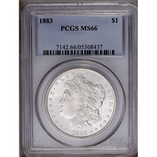 <B>1883<img border='0' src='http://www.heritagecoins.com/images/star.gif' width=10 height=10>$1> MS66 PCGS.</B></I> The creamy-white surfaces are boldly struck in all areas and have come away virtually unscathed from coin-to-coin contact.