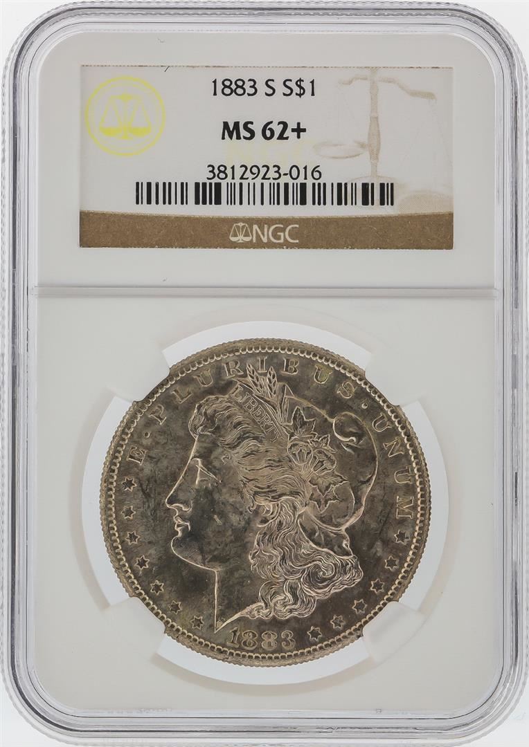 One 1883-S $1 Morgan Silver Dollar Coin NGC Graded MS62+. NGC Certified.
