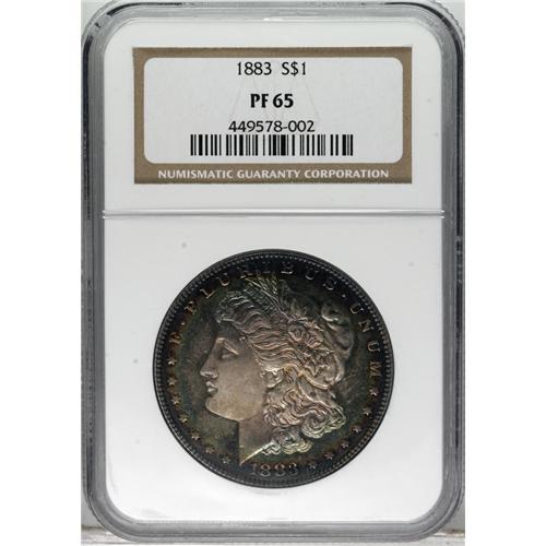 <B>1883 S$1 PR65 NGC.</B></I> Walter Breen (1977) says of the 1883 proof dollars: "Some of the surviving proofs are badly cleaned, many are nicked and scratched, suggesting that on this date (as on others through the early and middle 1890s) some of the proofs were spent during the panic of 1893." The Gem offered in this lot is an obvious exception to Breen's comments. The iridescent multicolored surfaces are nicely preserved for the grade designation; Liberty's cheek is nearly as clean as the day the coin came off the press. Exquisite definition is noted on all of the design elements. Census: 58 in 65, 35 finer (3/07).<BR><BR><b>Shipping:</b> Coins & Currency (<a target="_blank" href="http://www.heritageauctions.com/common/shipping.php">view shipping information</a>)
