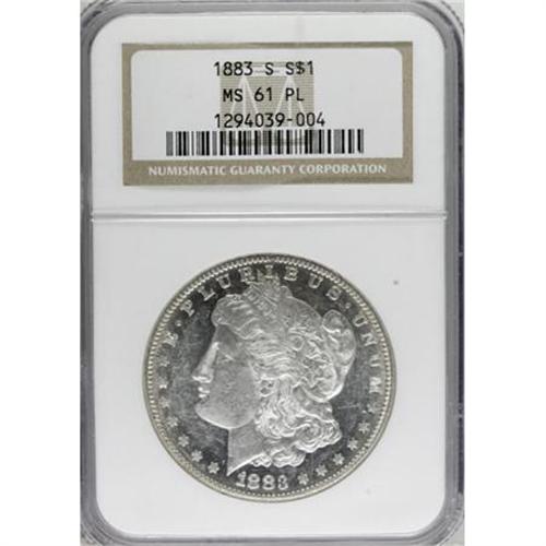 <B>1883-S $1 MS61 Prooflike NGC.</B></I> NGC Census: (5/39). PCGS Population (7/14). Numismedia Wsl. Price for NGC/PCGS coin in MS61: $525. (#7149)<BR><I>From The Diamond Head Collection.</B></I><BR><BR><B>Coin Engraver:</B> George T. Morgan<BR><BR><b>Shipping:</b> Coins & Currency (<a target="_blank" href="http://www.heritageauctions.com/common/shipping.php">view shipping information</a>\)