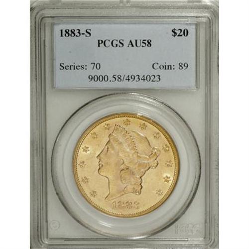 <B>1883-S $20 AU58 PCGS.</B></I> PCGS Population (199/947). NGC Census: (294/1121). Mintage: 1,189,000. Numismedia Wsl. Price for NGC/PCGS coin in AU58: $685. (#9000)<BR><BR><B>Coin Engraver:</B> James B. Longacre<BR><BR><b>Shipping:</b> Coins & Currency (<a target="_blank" href="http://www.heritageauctions.com/common/shipping.php">view shipping information</a>\)