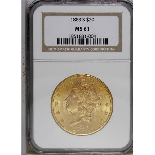 1883-S $20 MS61 NGC. The surfaces have rich yellow-ora