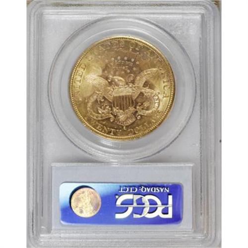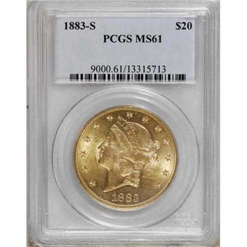 <B>1883-S $20 MS61 PCGS.</B></I> PCGS Population (317/672). NGC Census: (561/434). Mintage: 1,189,000. Numismedia Wsl. Price for NGC/PCGS coin in MS61: $900. (#9000)<BR><BR><B>Coin Engraver:</B> James B. Longacre<BR><BR><b>Shipping:</b> Coins & Currency (<a target="_blank" href="http://www.heritageauctions.com/common/shipping.php">view shipping information</a>)