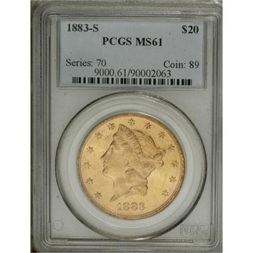 <B>1883-S $20 MS61 PCGS.</B></I> PCGS Population (315/664). NGC Census: (556/425). Mintage: 1,189,000. Numismedia Wsl. Price for NGC/PCGS coin in MS61: $800. (#9000)<BR><BR><B>Coin Engraver:</B> James B. Longacre<BR><BR><b>Shipping:</b> Coins & Currency (<a target="_blank" href="http://www.heritageauctions.com/common/shipping.php">view shipping information</a>)