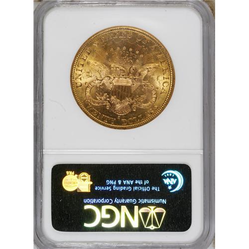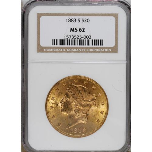<B>1883-S $20 MS62 NGC.</B></I> A somewhat scuffy appearance on the obverse limits the grade of this Mint State example. All of the design elements are well struck, except for the mushy mintmark.<BR><BR><b>Shipping:</b> Coins & Currency (<a target="_blank" href="http://www.heritageauctions.com/common/shipping.php">view shipping information</a>)