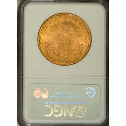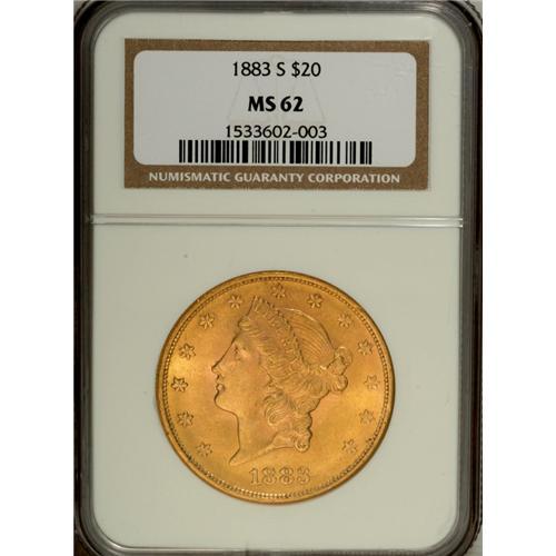 <B>1883-S $20 MS62 NGC.</B></I> Despite this date being reasonably attainable in mint state, this example displays pleasing surfaces and attractive two-toned rose gold highlights that make it a very engaging example for this grade. Census: 281 in 62, 66 finer (12/06).<BR><BR><b>Shipping:</b> Coin/Currency (<a target="_blank" href="http://www.heritageauctions.com/common/shipping.php">view shipping information</a>)