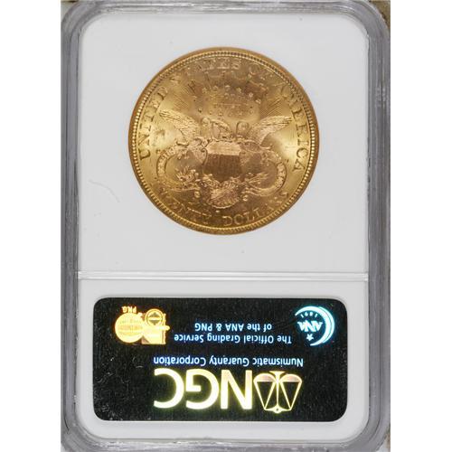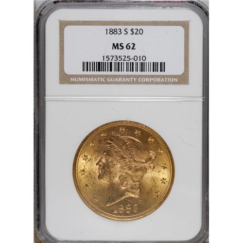<B>1883-S $20 MS62 NGC.</B></I> Sharply struck with intense cartwheel luster on both sides, and attractive even coloration over the nicely preserved surfaces. The reverse is only slightly marked, while a few moderate abrasions on Liberty's cheek and in the adjacent field area limit the grade.<BR><BR><b>Shipping:</b> Coins & Currency (<a target="_blank" href="http://www.heritageauctions.com/common/shipping.php">view shipping information</a>)