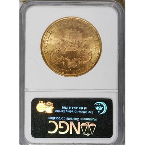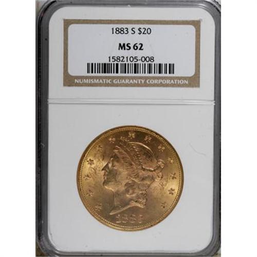<B>1883-S $20 MS62 NGC.</B></I> NGC Census: (337/65). PCGS Population (466/143). Mintage: 1,189,000. Numismedia Wsl. Price for NGC/PCGS coin in MS62: $1,250. (#9000)<BR><BR><B>Coin Engraver:</B> James B. Longacre<BR><BR><b>Shipping:</b> Coins & Currency (<a target="_blank" href="http://www.heritageauctions.com/common/shipping.php">view shipping information</a>\)