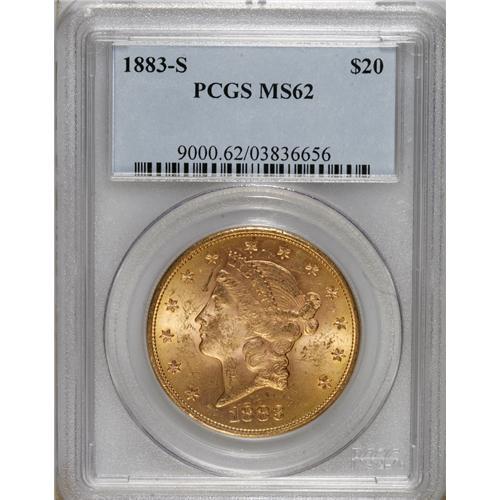 <B>1883-S $20 MS62 PCGS.</B></I> A highly lustrous and sharply impressed Liberty twenty that boasts a clean reverse. The obverse is a bit abraded, as usual for the MS62 level.<BR><BR><b>Shipping:</b> Coins & Currency (<a target="_blank" href="http://www.heritageauctions.com/common/shipping.php">view shipping information</a>)