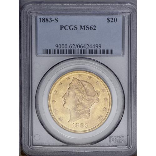 <B>1883-S<$20> MS62 PCGS.</B></I> A lustrous example with a very good strike. There is a small scrape between obverse stars 11 and 12, and Liberty's cheek has several individually trivial contact marks. However, the surfaces on the whole are better preserved than is the case for most survivors of this issue. <BR><BR><B>Important notice:</B> Heritage usually auctions material at the rate of 200-250 lots per hour. On some occasions eBay Live bid software or the Internet may not be able to keep up with the pace of the auction. We recommend placing a realistic absentee bid now as insurance to avoid disappointment. Occasionally the auctioneer may eliminate or reject an eBay Live bid, and the auctioneer may also reopen a lot after the close of the eBay live bidding (usually because we missed an audience bid), and may reject your bid even if it shows you as the winning bidder. By bidding via eBay Live, you agree that Heritage may award the lot to another bidder at its sole discretion under the circumstances described above or any other reasonable circumstances. Since eBay bids are not shown to us until we open the lot on the floor, we treat those bids just like floor bids. In most cases the floor responds before the eBay bid is presented to us, due to Internet lag time, so for consistency we have made it a policy that floor bids are always considered first over tie eBay live bids. Also please note that all Heritage lots purchased through eBay Live carry a 20% Buyer's Premium. Please make sure you read the Terms and Conditions before you bid. This lot is being auctioned in conjunction with a live floor auction by Heritage Galleries & Auctioneers. All final auction and invoice information will be supplied by Heritage Galleries & Auctioneers, and all other information should be considered preliminary. Lot:4291 <BR><BR><B>Winning Notification and Billing:</B> After the FINAL session in this auction is complete, Heritage will send e-mail and snail mail invoices. This process normally takes several days. All final auction and invoice information will be supplied by Heritage Galleries & Auctioneers, and all other information should be considered preliminary. <BR><BR>This auction will be conducted on a live auction floor and over the Internet through eBay Live. If you choose to place an absentee bid, please take a moment to <font color='#0000ff'><u><a href='http://pages.ebay.com/liveauctions/help/before/laabsentee.html'>learn how eBay Live absentee bidding works</a></u></font><font color='#000000'>