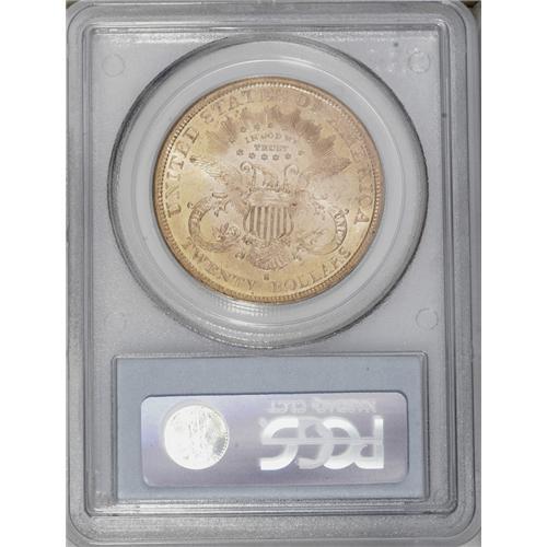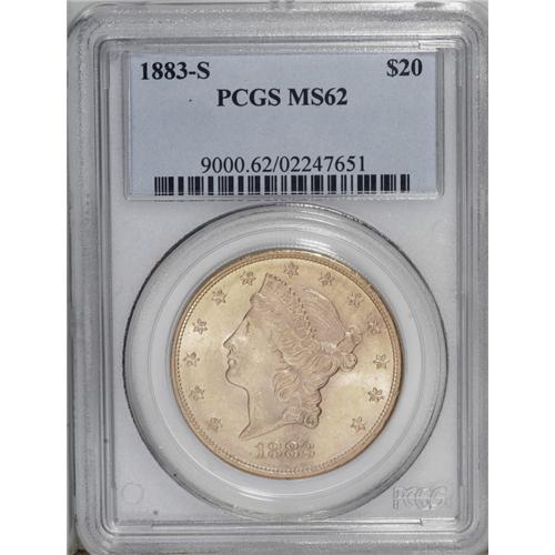 <B>1883-S<$20> MS62 PCGS.</B></I> A solidly struck yellow-gold piece with wheat-gold patches. The surfaces have plenty of luster, though abrasions are noted on Liberty's cheek and neck.