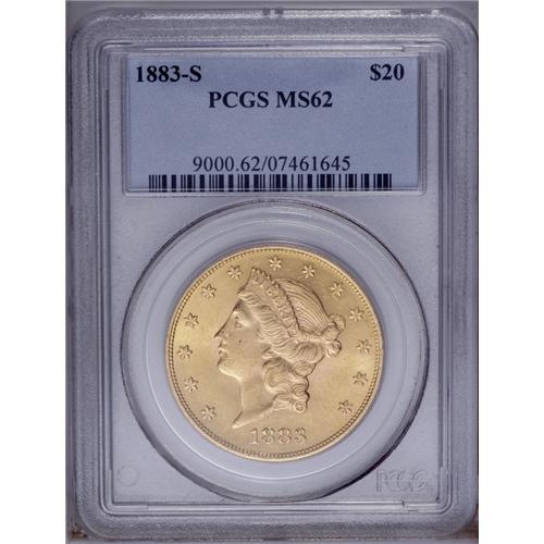 <B>1883-S<$20> MS62 PCGS.</B></I> This lustrous and conditionally difficult double eagle has fewer marks than is normal for the MS62 level. In addition, the strike is attentive, and the apricot-gold color is attractive.