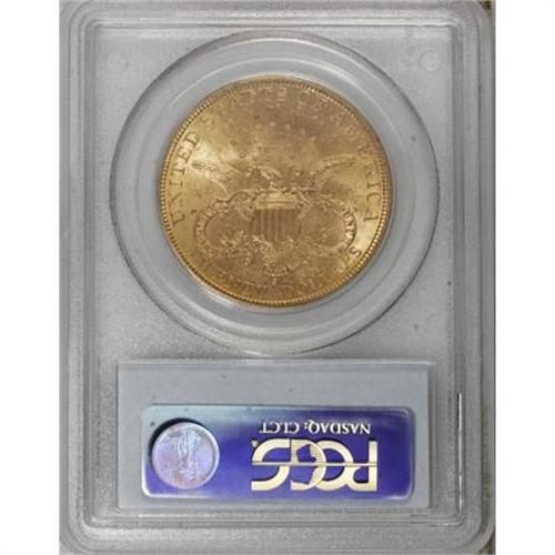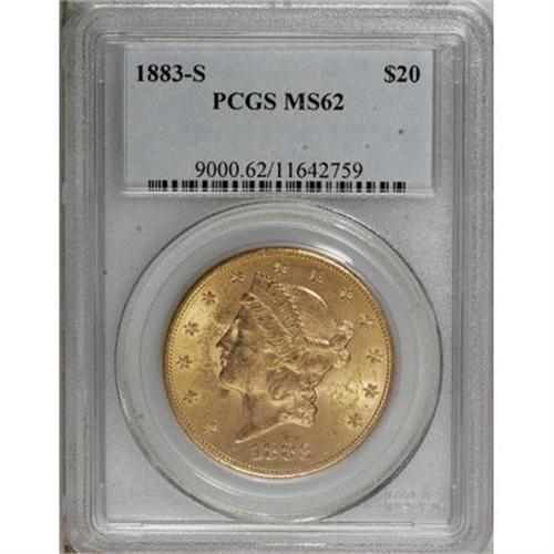 <B>1883-S $20 MS62 PCGS.</B></I> The yellow-orange fields of this lightly abraded S-mint double eagle have a slightly brassy quality. This crisply struck example displays a degree of olive copper staining at Liberty's face and throat.<BR><BR><b>Shipping:</b> Coins & Currency (<a target="_blank" href="http://www.heritageauctions.com/common/shipping.php">view shipping information</a>)