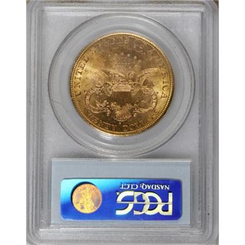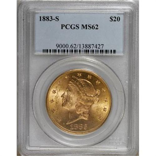 <B>1883-S $20 MS62 PCGS.</B></I> Well struck except for the rather mushy mintmark. Bright satiny luster shines from the obverse and reverse surfaces. The scattered marks and luster grazes displayed by this San Francisco Mint product are as expected for the grade. <BR><BR><b>Shipping:</b> Coins & Currency (<a target="_blank" href="http://www.heritageauctions.com/common/shipping.php">view shipping information</a>)