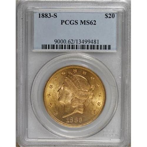 <B>1883-S $20 MS62 PCGS.</B></I> The small, squat S mintmark. Peach-gold surfaces exhibit bright luster, and reveal scattered minute obverse marks. An attentive strike brings out good definition on the design elements.<BR><BR><B>Coin Engraver:</B> James B. Longacre<BR><BR><b>Shipping:</b> Coins & Currency (<a target="_blank" href="http://www.heritageauctions.com/common/shipping.php">view shipping information</a>)