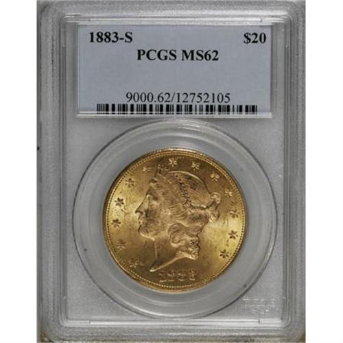 <B>1883-S $20 MS62 PCGS.</B></I> Frosty light yellow surfaces with faint traces of subtle pink toning on each side of this lovely piece. Faint surface marks are evident but mostly inconsequential.<BR><BR><B>Coin Engraver:</B> James B. Longacre<BR><BR><b>Shipping:</b> Coins & Currency (<a target="_blank" href="http://www.heritageauctions.com/common/shipping.php">view shipping information</a>)