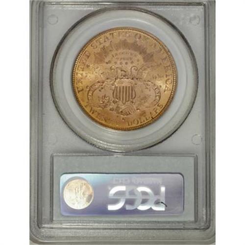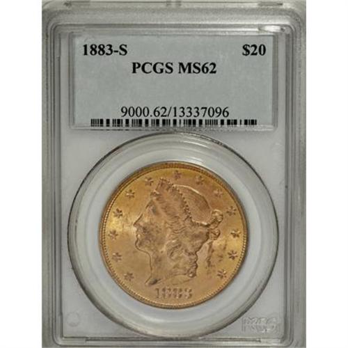 <B>1883-S $20 MS62 PCGS.</B></I> A powerful strike imparts virtual completeness to the design elements. Peach-gold patina graces somewhat prooflike surfaces, which show mostly on the reverse. A few minute marks help define the grade.<BR><BR><B>Coin Engraver:</B> James B. Longacre<BR><BR><b>Shipping:</b> Coins & Currency (<a target="_blank" href="http://www.heritageauctions.com/common/shipping.php">view shipping information</a>)