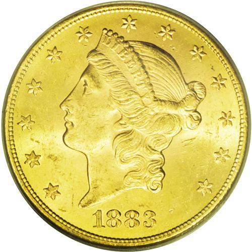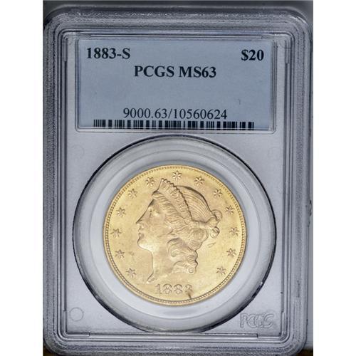 <B>1883-S<$20> MS63 PCGS.</B></I> This is a remarkable example and a condition rarity at this grade. In finer grades, this date is essentially unobtainable. Both sides are sharply struck and fully lustrous with brilliant yellow-gold surfaces. PCGS has only certified eight finer examples of this date (5/06).