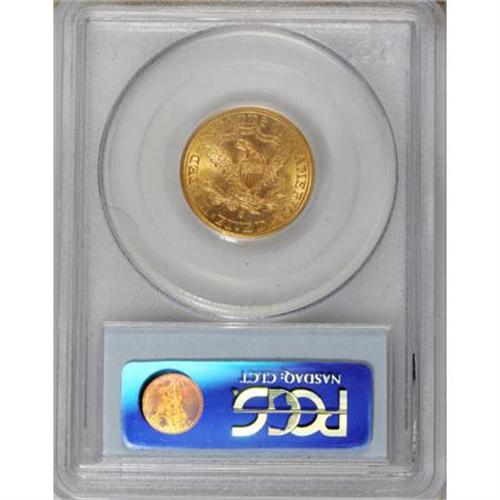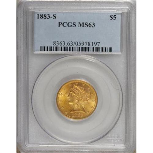 <B>1883-S $5 MS63 PCGS.</B></I> A brilliant greenish-gold example with frosty luster. A single mark in the left obverse field is evident, but no other significant marks are visible on either side. This is an extremely important opportunity to acquire a difficult date. Population: 11 in 63, 3 finer (6/07).<BR><BR><b>Shipping:</b> Coins & Currency (<a target="_blank" href="http://www.heritageauctions.com/common/shipping.php">view shipping information</a>)