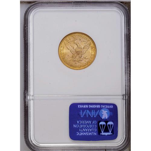 <B>1883-S<$5> MS64 NGC.</B></I> The 1883-S, with a mintage of 83,200 pieces, was once considered to be a common date, but is now recognized as scarce even in circulated grades, and prohibitively rare in the better grades of Mint State. In MS64, the level of preservation of the coin in this lot, a mere three pieces have been certified by NGC and PCGS, and none finer. Radiantly lustrous surfaces exhibit peach and pumpkin-gold patina with subtle light green undertones. A sharp, even strike prevails throughout, and minute marks on Liberty's cheek and neck and in the fields of both sides preclude a higher grade. Census: 2 in 64, 0 finer (3/06).