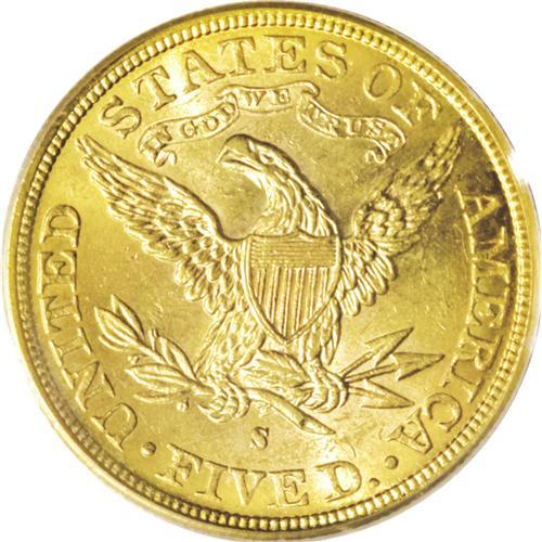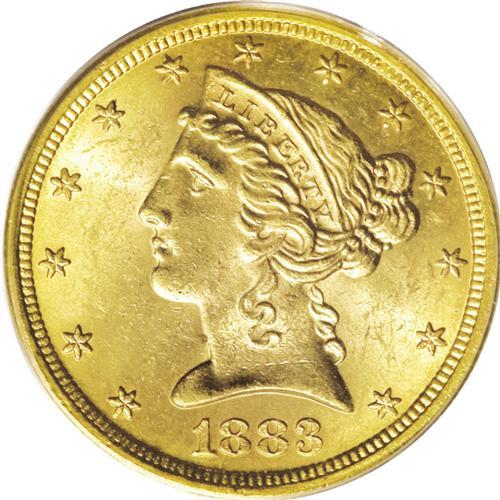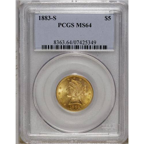<B>1883-S $5 MS64 PCGS.</B></I> This is one of the more underrated issues in the Liberty Head half eagle series. As the population data reveal, the date is at the very least scarce in all grades, and virtually unobtainable in the better grades of Mint State. The current near-Gem displays excellent luster and apricot-gold patination that takes on a slightly deeper shade around the margins. All of the design features are well executed. Minute contact marks on the cheek and neck limit the grade. Population: 2 in 64, 0 finer (10/06).<BR><BR><b>Shipping:</b> Coin/Currency (<a target="_blank" href="http://www.heritageauctions.com/common/shipping.php">view shipping information</a>)