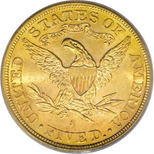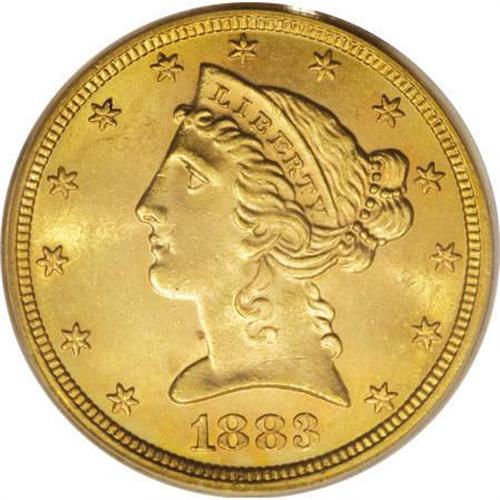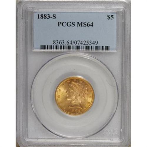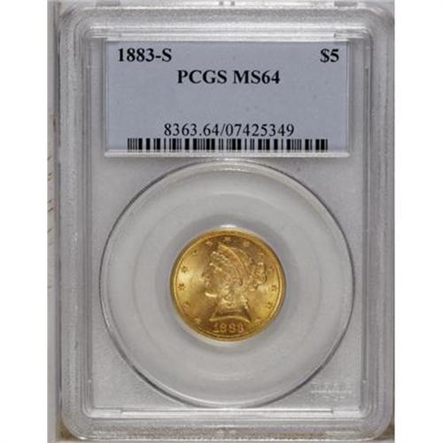 <B>1883-S $5 MS64 PCGS.</B></I> This is one of the more underrated issues in the Liberty half eagle series. As the population data reveals, the date is at least scarce in all grades, and virtually unobtainable in the better grades of Mint State. This near-Gem displays excellent luster and apricot-gold patination that takes on a slightly deeper shade around the margins. All of the design features are well executed. Population: 3 in 64, 0 finer (7/07).<BR><BR><B>Coin Engraver:</B> Christian Gobrecht<BR><BR><b>Shipping:</b> Coins & Currency (<a target="_blank" href="http://www.heritageauctions.com/common/shipping.php">view shipping information</a>)