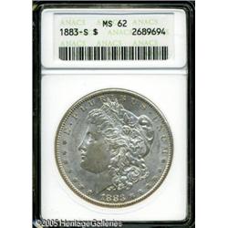 <B>1883-S<img border='0' src='http://www.heritagecoins.com/images/star.gif' width=10 height=10>$1 MS62 ANACS.</B></I> An essentially untoned better date Morgan Dollar with slightly subdued luster and a crisp strike. The reverse is well preserved, while the cheek has minor luster grazes. Lot:10133
