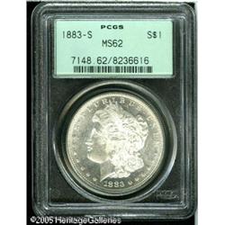 <B>1883-S<img border='0' src='http://www.heritagecoins.com/images/star.gif' width=10 height=10>$1 MS62 PCGS.</B></I> Well struck with amazingly bright, remarkably flashy surfaces, that are untoned, frosty, and mildly abraded, with intense semi-prooflike reflectivity in the fields. Lot:10134