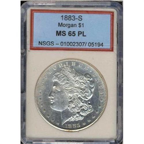 <b>1883-S Morgan Dollar. MS65 PL.</b> (graded MS65 PL by NSGS). Prooflike fields on both sides, with minor dullness to the frost on the cheek as well as the eagle. Given the proper amount of strike pressure, the coin would have been fully brought up by the dies. However, there are a few soft areas that are often encountered on this date, including some of the hair waves above Liberty's ear, visible in the photograph as flat-topped. We suggest a net grade a few points lower than 65 quality <b>(PCGS # 7149)</b>
