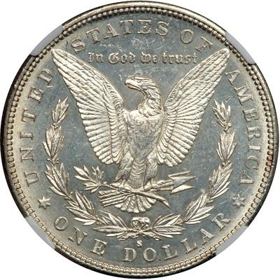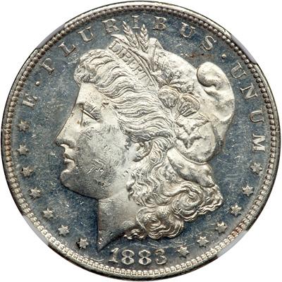 1883-S Morgan Dollar. NGC graded MS-60. The surfaces are semi-prooflike. Liberty's portrait is quite frosty, and displays some bagmarks. Scarcer S-mint release (PCGS # 7148) .