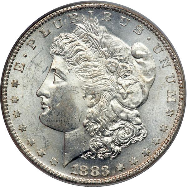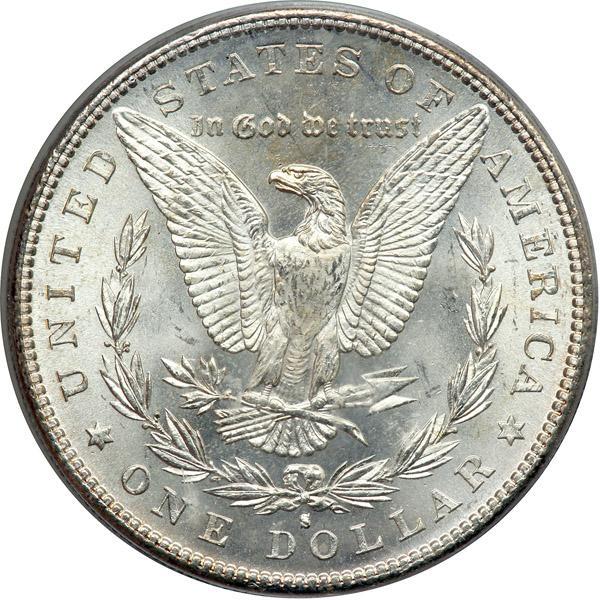 1883-S Morgan Dollar. PCGS graded MS-64. A choice satiny white specimen. Often compared to the 1884-S, and like the 1884-S, albeit to a lesser degree, the 1883-S is a conditionally rare issue. Circulated survivors from the original mintage of 6.2 million pieces are readily obtainable. This suggests a wide distribution into circulation at the time. In Mint condition, however, the '83-S is scarce to rare, depending on the particular coin's proximity to the Gem (65) grade level. This very Choice quality representative is vibrant with only a few light bagmarks in the fields. The balance of the features are richly frosted, and the strike is typically sharp for the date (similar to the 1879-S to 1882-S issues). The number of scattered abrasions is not excessive for the assigned grade. Pop 366; 26 finer (PCGS # 7148) .