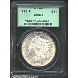 1883-S S$1 MS60 PCGS. A lustrous example, but the cheek and obverse field are thoroughly bagmarked, and the reverse field has faint fingerprints. Important notice: We expect to be auctioning lots at the rate of 200-250 per hour. Sometimes eBay Premier live bid software cannot keep up with that pace, so we strongly recommend that you place a realistic proxy bid now as insurance to avoid disappointment. Also please note that all Heritage/CAA lots purchased through eBay Premier carry a 20% Buyer's Premium. Please make sure you read the Terms and Conditions.
