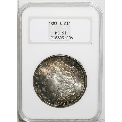 <B>1883-S<img border='0' src='http://www.heritagecoins.com/images/star.gif' width=10 height=10>$1> MS61 NGC.</B></I> A rich complement of deep, variegated toning appears near the periphery, on each side. Well struck and lustrous, the piece is moderately abraded on the obverse, limiting the grade. Housed in an early-generation NGC holder.